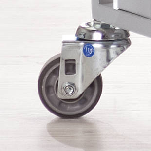 4 swivel castors, 2 with wheel stops. Wheel Ø 75 mm, ball bearing mounted. Non-marking thermoplastic rubber (TPR) tyres.